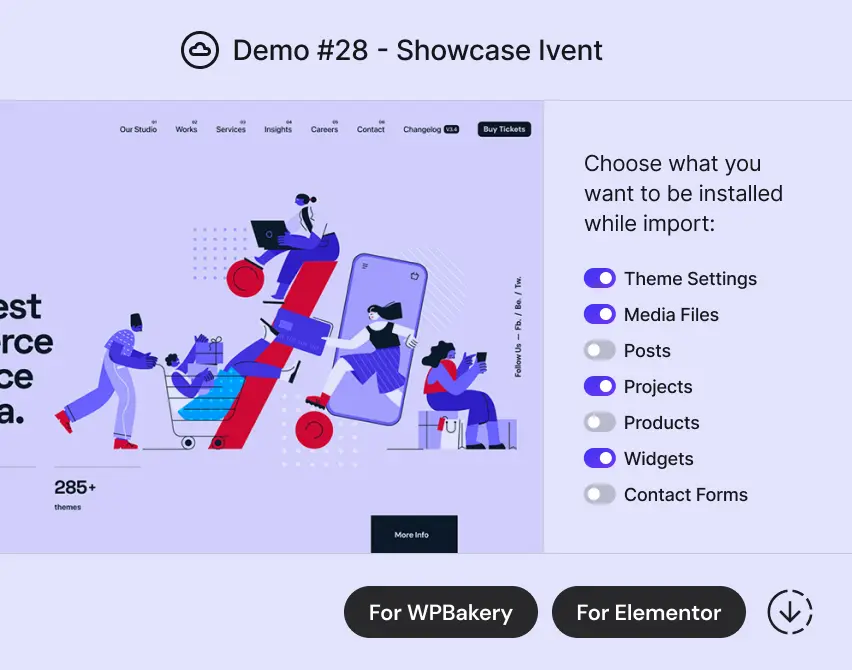 - 3 Bundled premium plugins: WPBakery Page Builder, Slider Revolution and Advanced Custom Fields Pro at no extra cost.